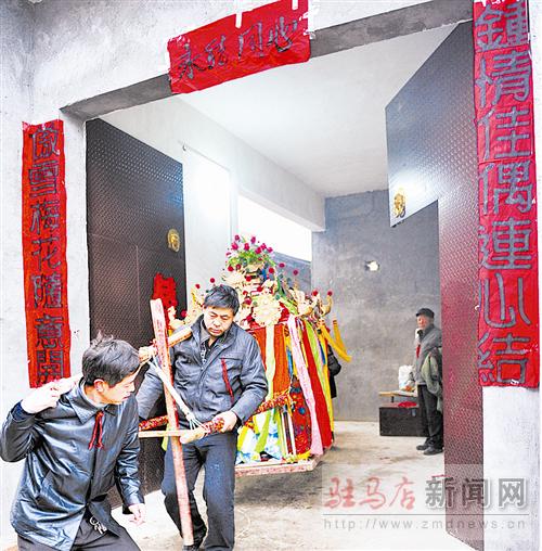 院子里,一頂鮮艷的花轎很惹眼,花轎頂端布滿各式的銅鏡和花翎,周身纏繞七色彩條。“轎頭”萬玉德告訴記者,這頂用椿木打造的花轎是他爺爺?shù)臓敔斪龅?,現(xiàn)在傳到了他的手中。“這頂花轎,娶回上千個(gè)新娘子了。”萬玉德自豪地說。
