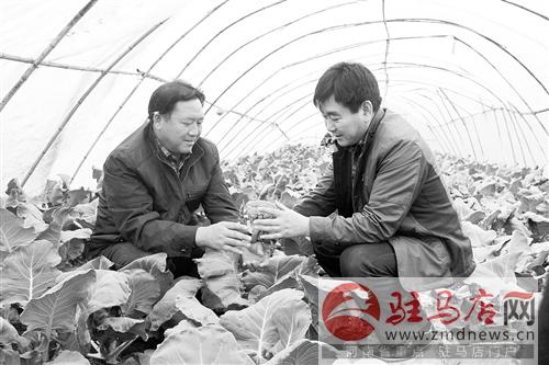 近日,泌陽縣盤古煙葉育苗工廠育苗專業(yè)戶郭騰友在技術(shù)員的指導(dǎo)下對反季節(jié)蔬菜西蘭花進(jìn)行管理。近年來,他在煙葉育苗的同時套種蔬菜,綜合收入在20萬元以上。記者 唐
