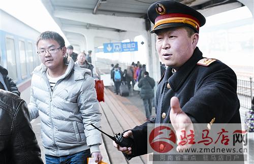 “請在規(guī)定的道路上行走,小心安全。”“列車要到站了,請大家拿好行李。”大年三十上午10時許,駐馬店火車站站臺上,急著回家的旅客們腳步匆匆,駐馬店火車站客運值班站長張中順不停地提醒旅客們要注意的事項。