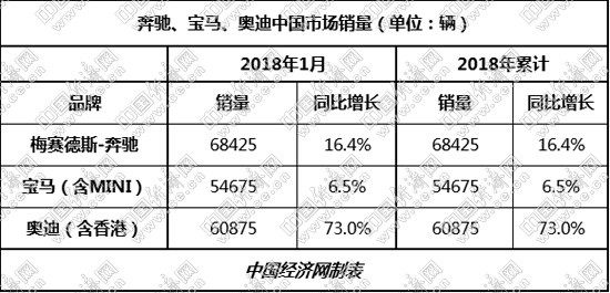過(guò)去一年,奧迪、奔馳、寶馬在中國(guó)市場(chǎng)均以60萬(wàn)輛左右的歷史最佳銷量,為2017年畫上完美句點(diǎn)。進(jìn)入新的一年,奧迪、奔馳又都以超過(guò)6萬(wàn)輛的1月銷量為2018年贏得開(kāi)門紅,并將ABB之爭(zhēng)推向全新高度。面對(duì)兩大競(jìng)爭(zhēng)對(duì)手新年首月的實(shí)力亮相,寶馬則依然按照自身節(jié)奏,穩(wěn)步向前。