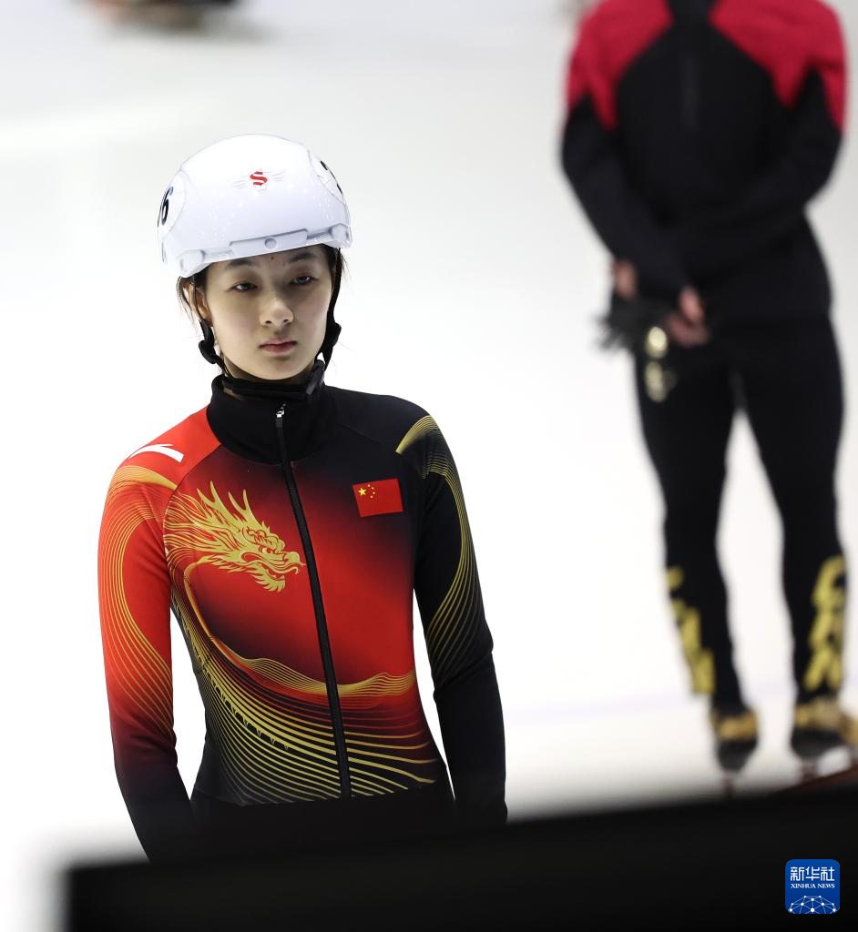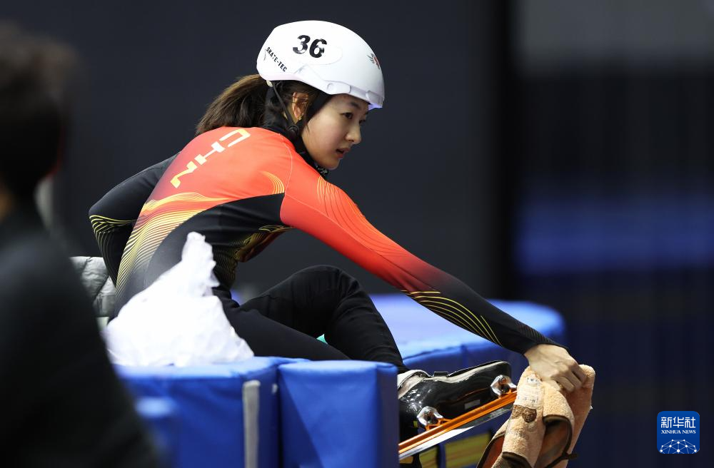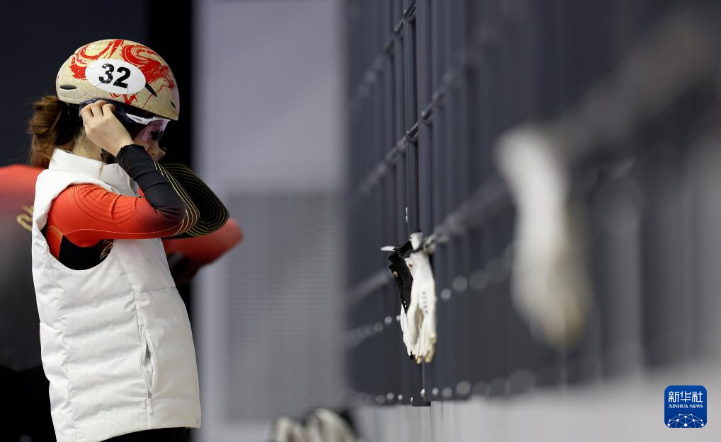 1月29日,中國(guó)短道速滑隊(duì)選手楊婧茹在訓(xùn)練前做準(zhǔn)備。
