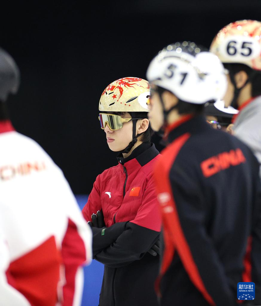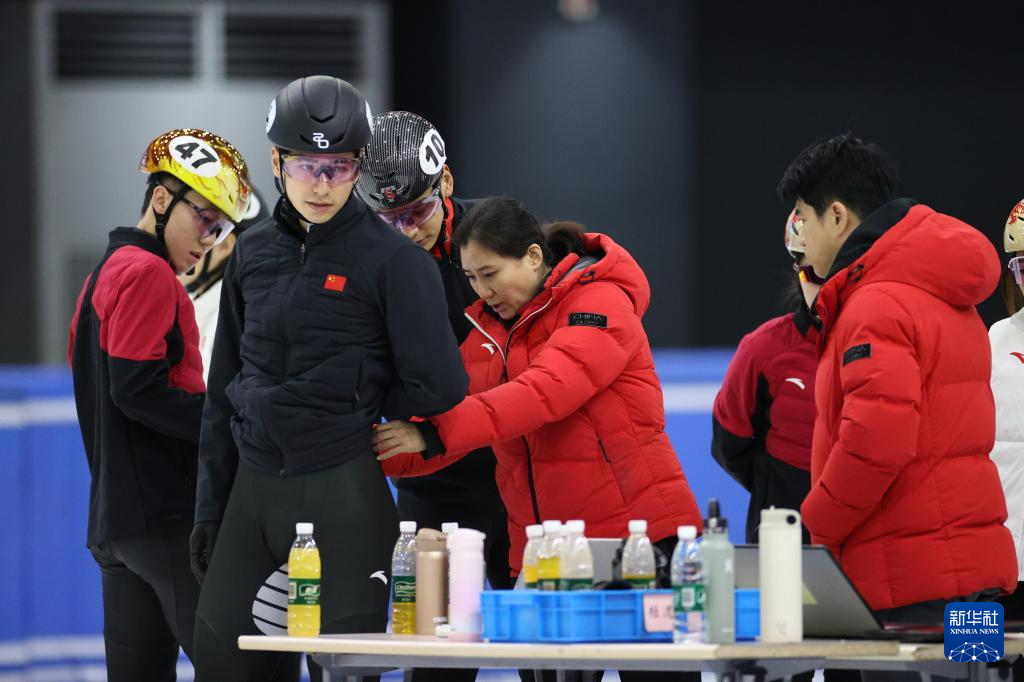 1月29日,中國(guó)短道速滑隊(duì)教練張晶(中)在訓(xùn)練中為隊(duì)員劉少昂(左二)整理服裝。