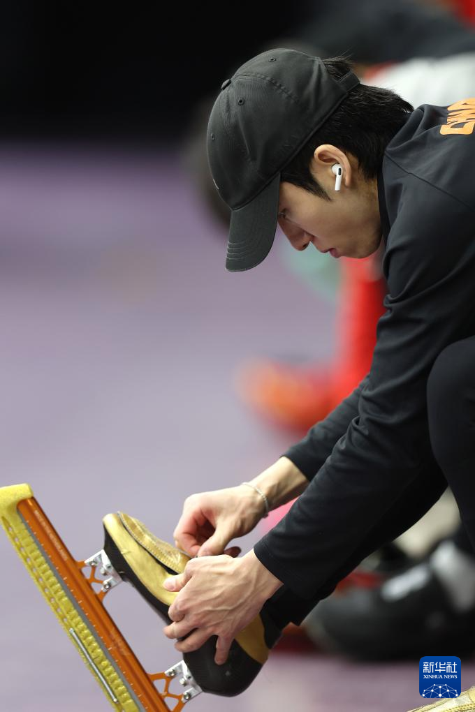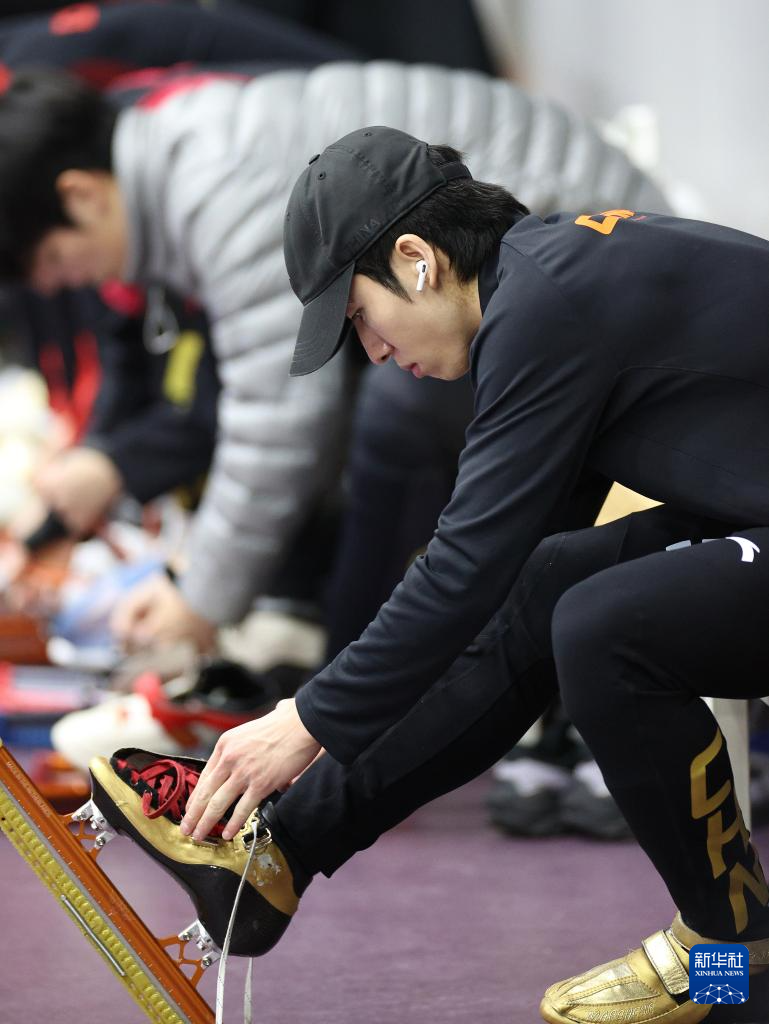 1月29日,中國(guó)短道速滑隊(duì)選手林孝埈在訓(xùn)練前穿上冰刀鞋。