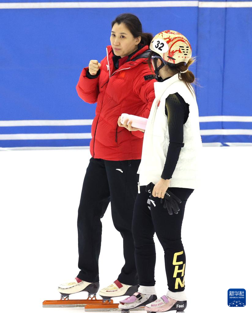 1月29日,中國(guó)短道速滑隊(duì)教練張晶(左)在訓(xùn)練中為隊(duì)員楊婧茹加油。