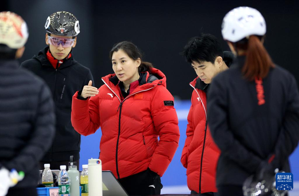 1月29日,中國(guó)短道速滑隊(duì)教練張晶(中)布置訓(xùn)練任務(wù)。