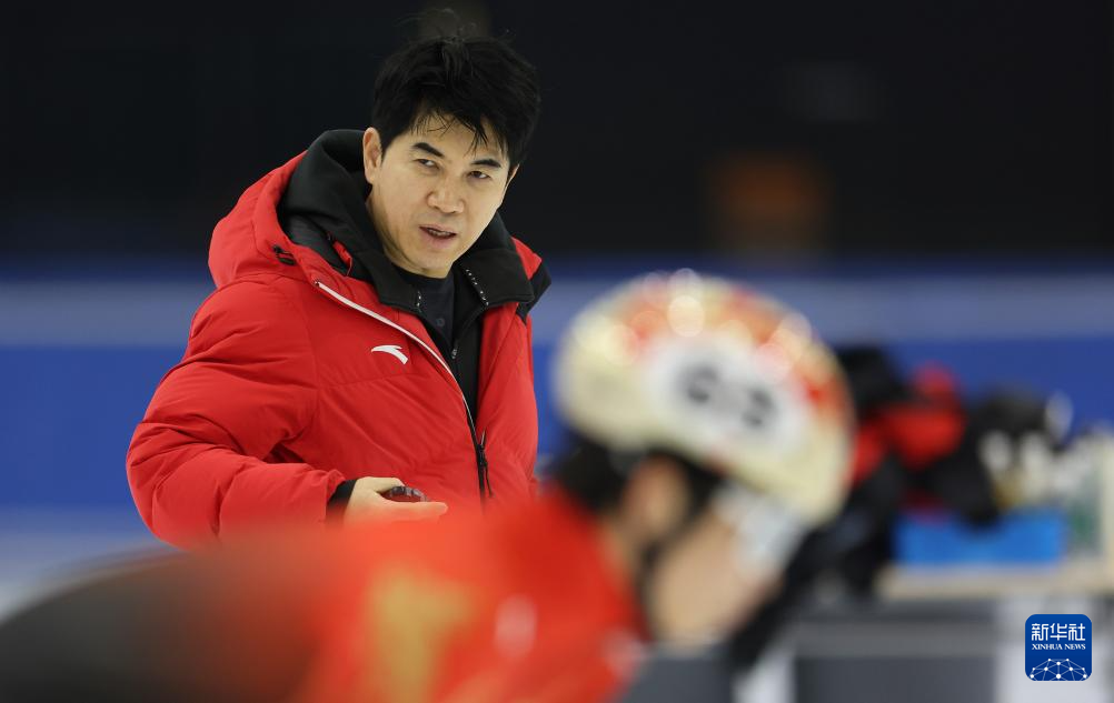 1月29日,中國(guó)短道速滑隊(duì)教練全宰秀在訓(xùn)練中指導(dǎo)隊(duì)員。