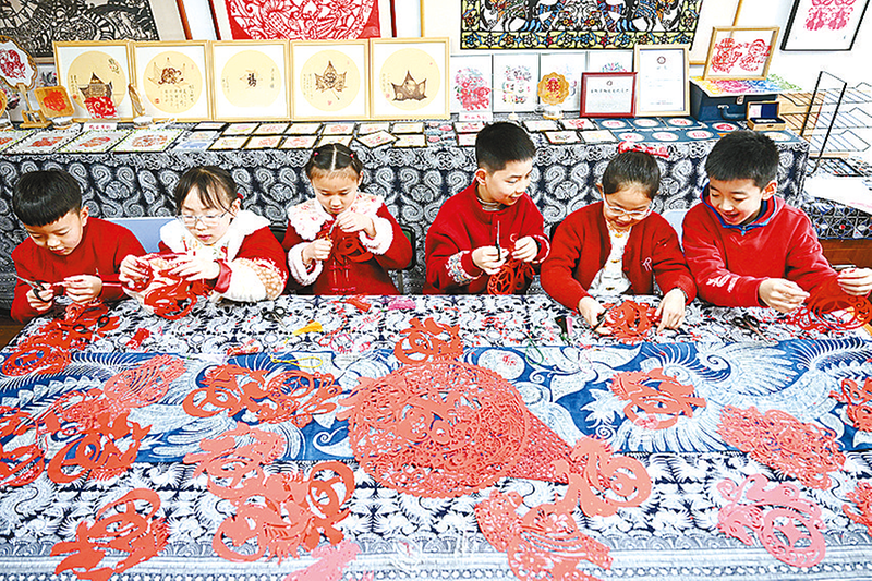 2月2日,在江蘇省興化市昭陽(yáng)街道的畢飛宇工作室內(nèi),興化市昭陽(yáng)湖幼兒園的孩子們?cè)诶蠋煹闹笇?dǎo)下創(chuàng)作以生肖馬為主題的剪紙。