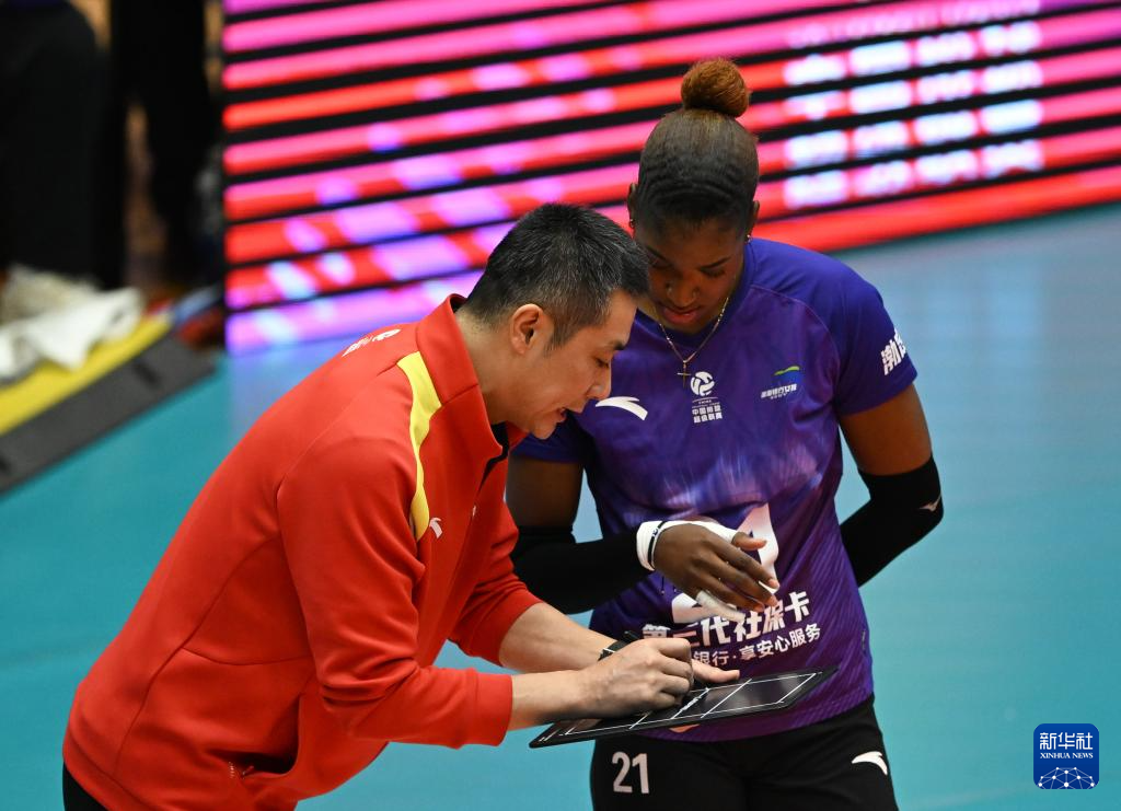 2月25日,天津渤海銀行隊(duì)球員馬丁內(nèi)斯(左)與娜塔莉亞(右)在比賽中交流。