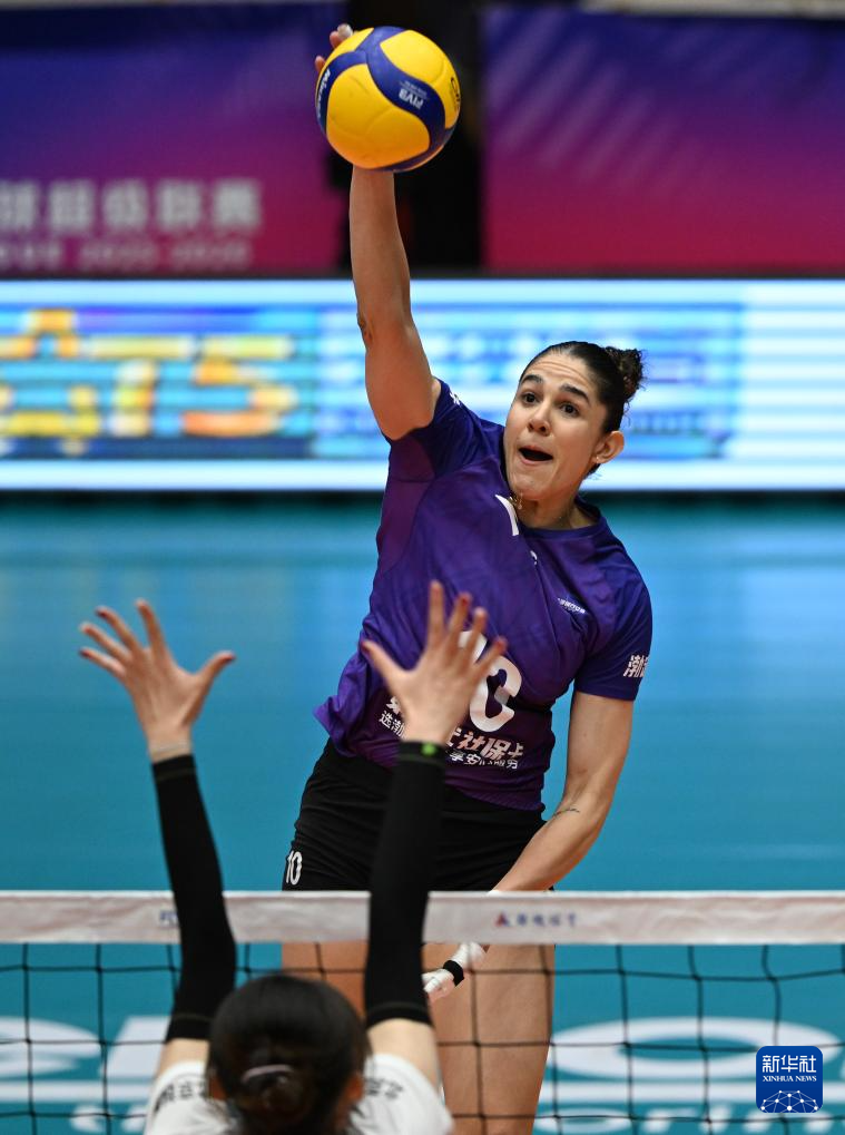 2月25日,天津渤海銀行隊(duì)球員娜塔莉亞在比賽中扣球。