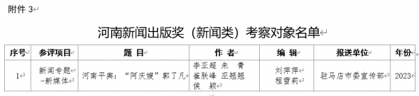 按照《中共河南省委宣傳部關(guān)于做好河南新聞出版獎(jiǎng)推薦評(píng)選工作的通知》(豫宣通〔2025〕41號(hào))精神,根據(jù)省委宣傳部《河南新聞出版獎(jiǎng)(新聞?lì)悾┏鯇彿答佉庖姟?,?jīng)評(píng)選工作專班專業(yè)評(píng)審組進(jìn)行初審評(píng)選,確定駐馬店日?qǐng)?bào)社9件作品、駐馬店廣播電視臺(tái)8件作品、縣級(jí)融媒體中心1件作品為河南新聞出版獎(jiǎng)(新聞?lì)悾┛疾鞂?duì)象。為充分發(fā)揚(yáng)民主,廣泛聽取意見,接受社會(huì)監(jiān)督,現(xiàn)將擬推薦對(duì)象予以公示(見附件)。